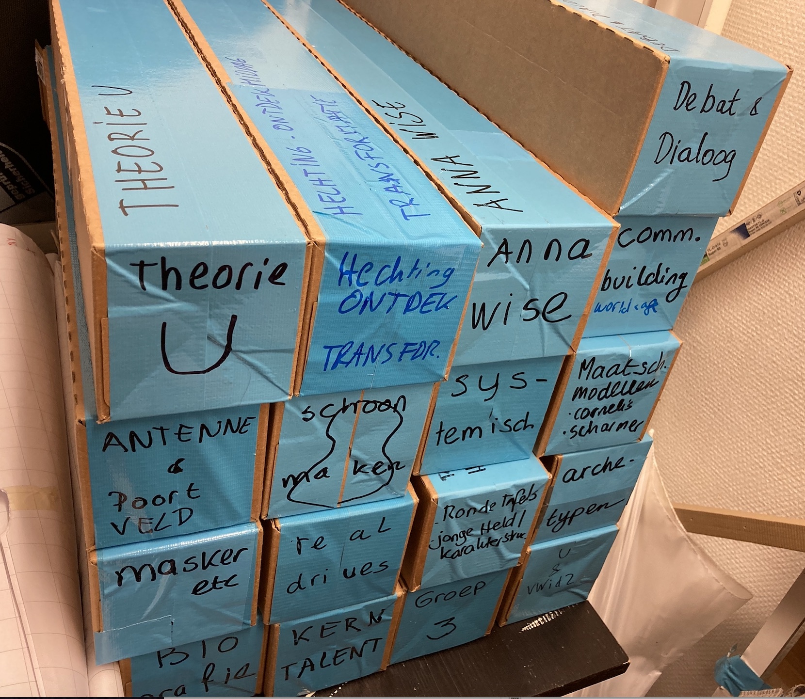 - De flaps voor de diverse trainingen bewaarden we in deze dozen.